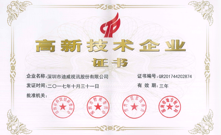 “國家級高新技術(shù)企業(yè)”稱號,是中國科技企業(yè)最高的榮譽(yù)之一,是國家對企業(yè)科研實力一個最權(quán)威的肯定,是企業(yè)對外交往時一張重要的“金名片”。獲此殊榮是社會對迪威迅的高度認(rèn)可。