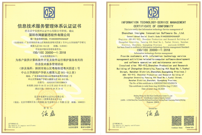 ISO20000是國(guó)際公認(rèn)的面向機(jī)構(gòu)的IT服務(wù)管理體系,是衡量企業(yè)運(yùn)營(yíng)和服務(wù)管理水平高低的重要標(biāo)識(shí),被譽(yù)為IT服務(wù)的“管理圣經(jīng)”。此次通過(guò)認(rèn)證,標(biāo)志著深圳新思的信息技術(shù)服務(wù)管理水平達(dá)到了國(guó)際化標(biāo)準(zhǔn)。
