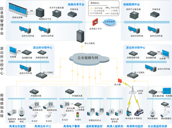 該部分網(wǎng)絡(luò)主要包括公安信息網(wǎng)、視頻專網(wǎng)、運(yùn)營(yíng)商公共網(wǎng)絡(luò)等組成。本次項(xiàng)目需構(gòu)建視頻專網(wǎng),用于承載視頻信息數(shù)據(jù)傳輸。視頻專網(wǎng)采用統(tǒng)一的、基于IP的網(wǎng)絡(luò)平臺(tái),適應(yīng)未來(lái)的升級(jí)擴(kuò)展要求;使用先進(jìn)、成熟的產(chǎn)品和技術(shù)保證網(wǎng)絡(luò)的可靠性。視頻專網(wǎng)為視頻監(jiān)控?cái)?shù)據(jù)傳輸、存儲(chǔ)與處理提供可靠的網(wǎng)絡(luò)通信保障。